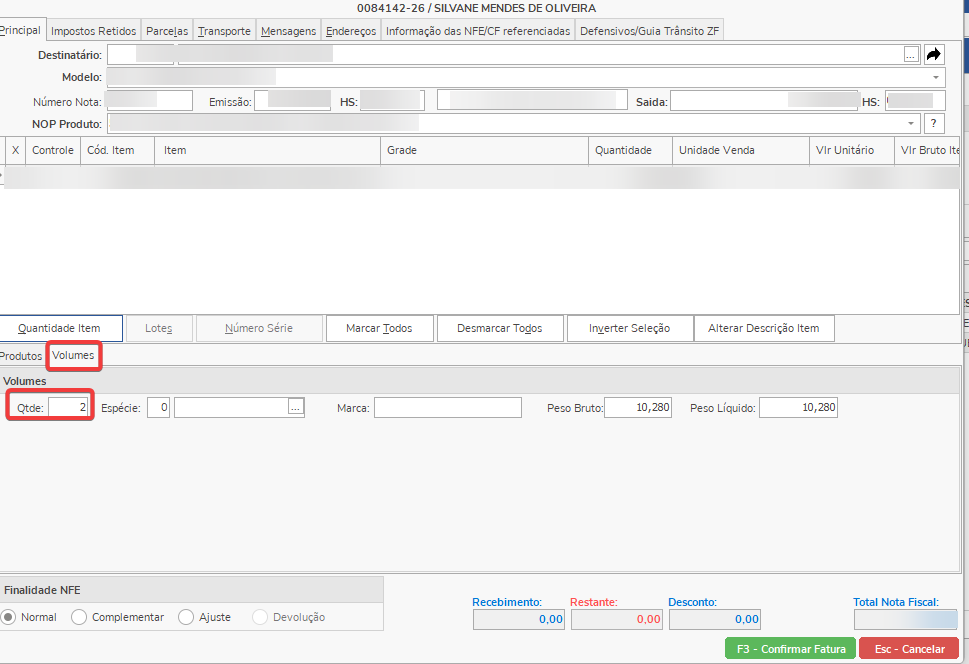 Deste modo é como vai ficar na nota fiscal, o caixa pode informar a quantidade (Qtde.), Espécie, Marca, Peso Bruto e Peso Líquido. Essas informações não alteram o cadastro do item e o pedido.
